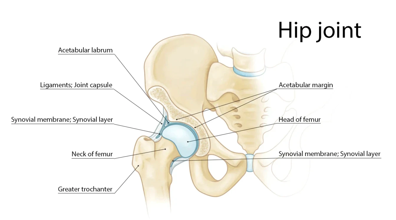 The hip labrum is a ring of fibrocartilage that surrounds the outer edge of the acetabulum (the socket part of your hip joint). It acts as a cushion and a seal for the hip joint, helping to deepen the socket for added stability. The labrum also aids in smooth pain-free joint function and shock absorption during movement. When the labrum is torn, it can lead to mechanical issues, instability, and pain.